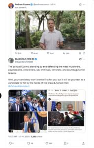 In this thread on X, a user responds to Cuomo’s post by insulting Israelis and characterizing them as “mass murderers, psychopaths, child killers [a modern recasting of the classic blood libel trope], war criminals, terrorists, and scumbag Zionist Israelis.” The user employs this hateful language both to condemn Cuomo for supporting Israel and to express endorsement of Mamdani.