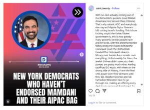 This post on X with 52.9K views makes the antisemitic allegation that Jews control Mamdani. The user depicts Jews as evil beings who seek to “destroy Whites and/or Christians” and who “undermine White Christian nations,” by exerting control over Mamdani’s campaign.