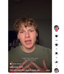 While denying Israel’s right to exist can be antisemitic, it does not constitute a policy violation on TikTok. However, this user’s vilification of Jews and Zionists does violate the platform’s Hate Speech and Hateful Behavior Community Guidelines.