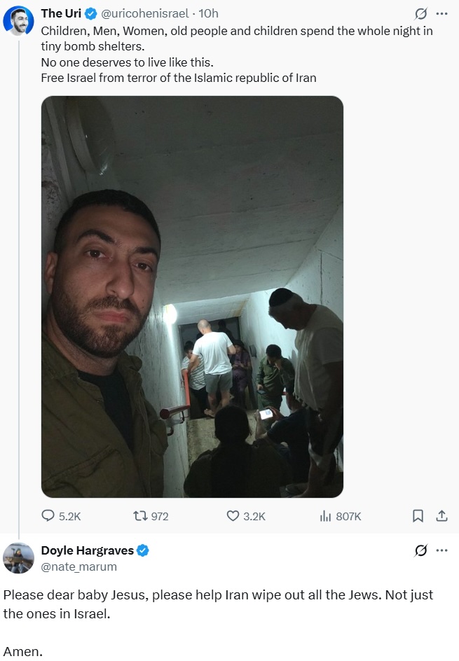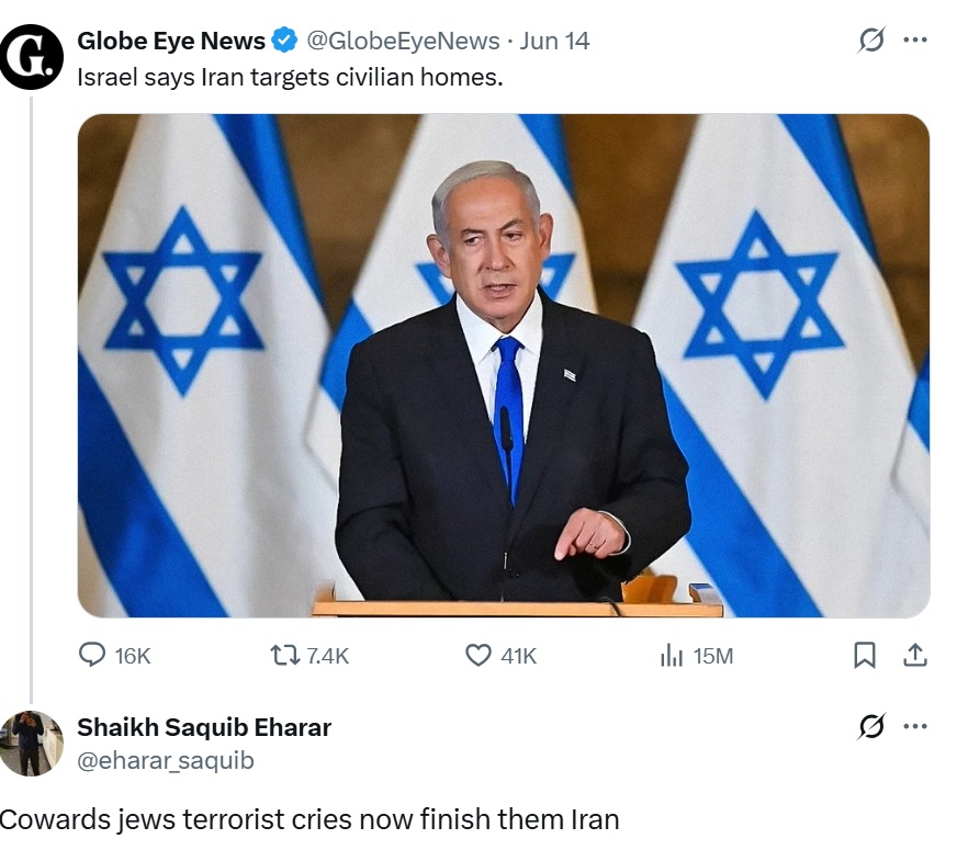 In the tweet below, a well-known Jewish and Israeli influencer shares a photo of himself in a bomb shelter as ballistic missiles rain down across Israel. He’s trying to raise awareness about what’s happening on the ground. In response, another user replies with a chilling message: a wish for Iran to “wipe out all the Jews”. No subtlety, just raw hatred, posted in plain sight.