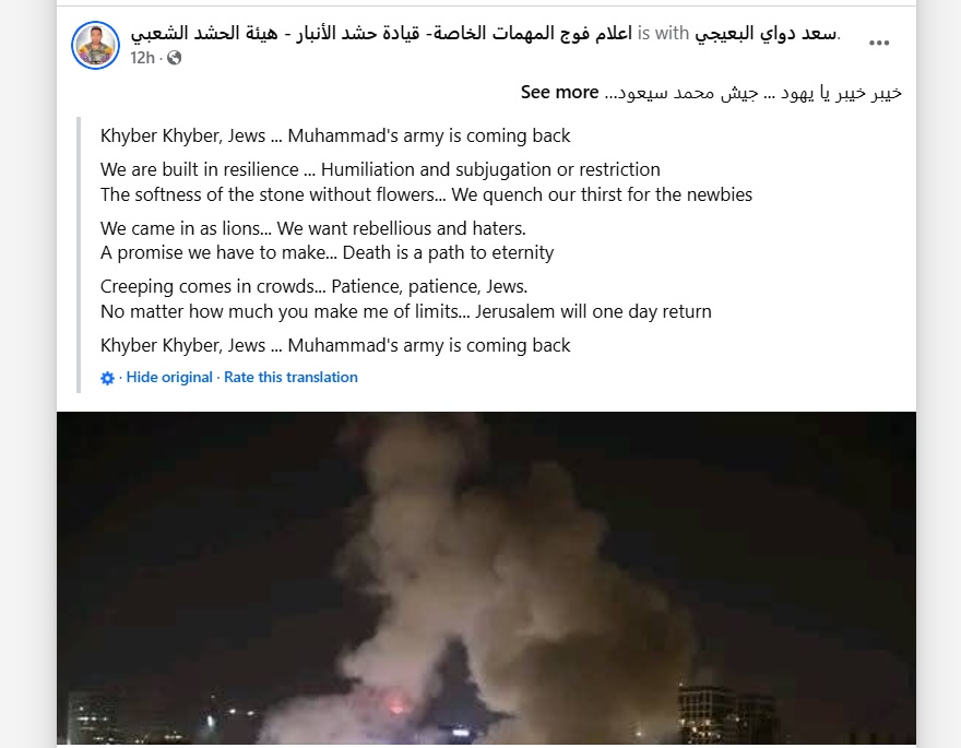 In the Facebook post below, the user shares an image of Tel Aviv under attack from Iranian missiles — and includes the same chant in Arabic. Through this poetic incitement, the user glorifies martyrdom, dehumanizes Jews by calling them “oppressors” and “haters”, and presents violence not only as justified, but as sacred.