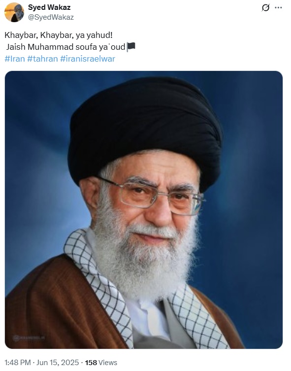 In this tweet, the chant appears transliterated in English, accompanied by a photo of Ayatollah Ali Khamenei — likely meant to glorify him and portray his decision to attack Israel as heroic or divinely sanctioned.