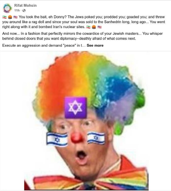 The Facebook post below reflects this claim. The user accuses President Donald Trump of being controlled by Jews, referencing the “Sanhedrin” and “Talmudic” behavior to suggest religious and political subservience amid the conflict.