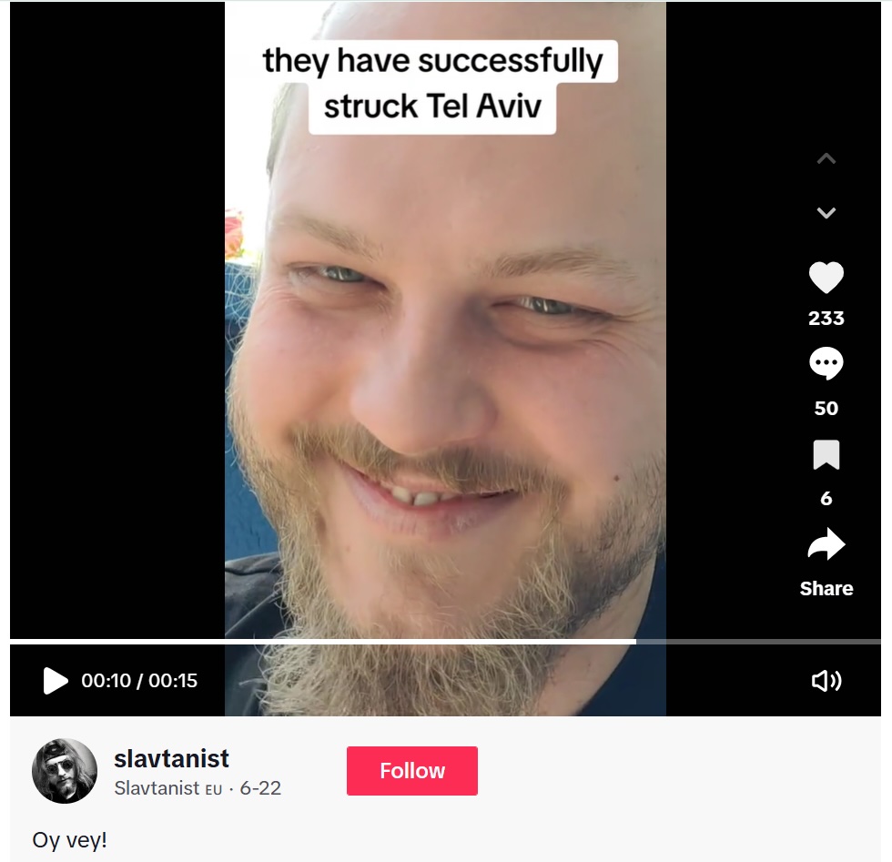 This TikTok video is a clear example of glorification of violence. The user visibly laughs and celebrates Iran’s ballistic missile attack, treating it like a joke. The caption reads “Oy vey!”— a Yiddish phrase often used to express distress or frustration — now twisted into mockery, ridiculing Jewish suffering. To make it worse, the background music is the traditional Jewish song Hava Nagila, repurposed here not in celebration, but as a tool for dehumanization.