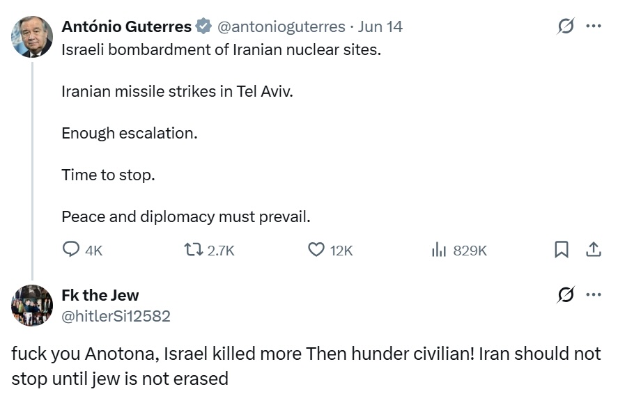 In the example below, United Nations (UN) Secretary-General António Guterres calls for calm and a halt to escalation. A user responds by cursing him out, accusing Israel of killing civilians, and then takes it further — arguing that “Iran should not stop” until every Jew is “erased”. And yes, their username is just as aggressive as their message.