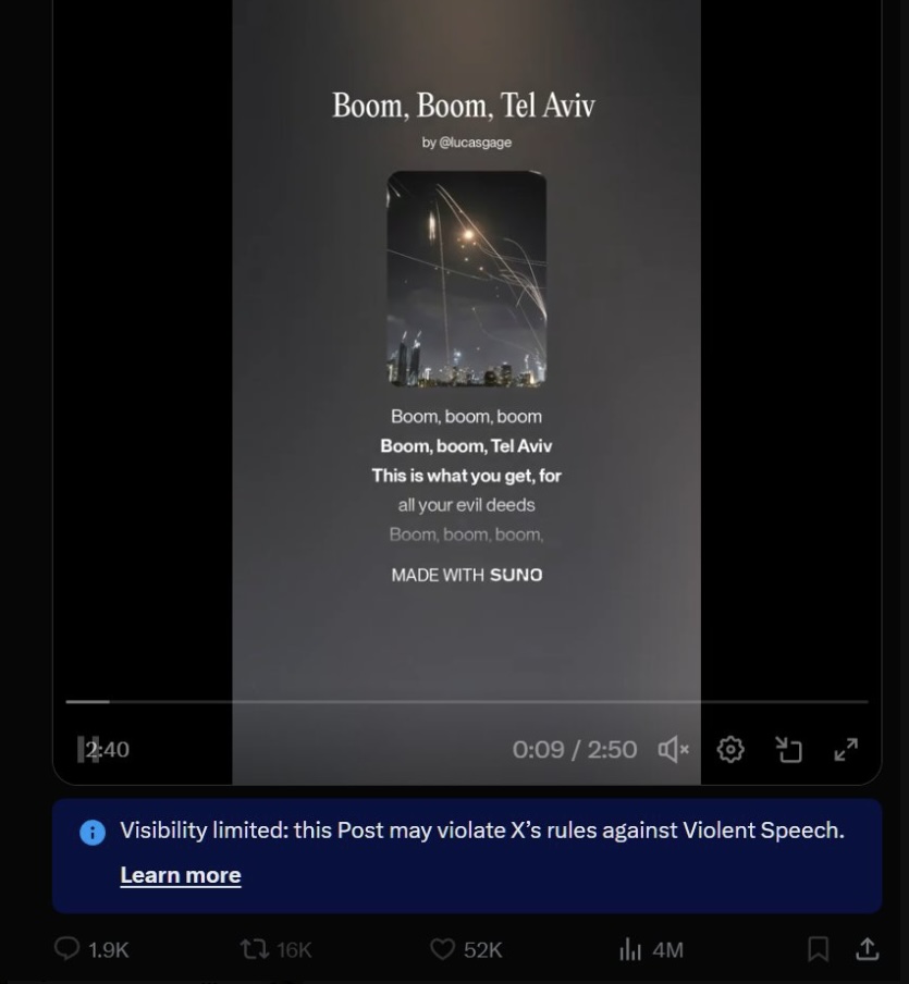 Amid the conflict, X user Lucas Gage released a song titled “Boom, Boom, Tel Aviv” using the AI music platform Suno. Gage is a repeat offender when it comes to spreading antisemitic content online, including content that promotes Holocaust denial. In March, Gage posted a video using Suno on X, scapegoating Jews for former U.S. President John F. Kennedy’s (JFK) assassination, called “Kennedy Killers”. The song also included offensive generalizations as well as dehumanizing comments towards Jews.
