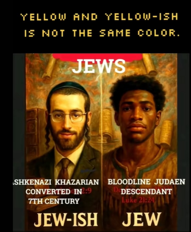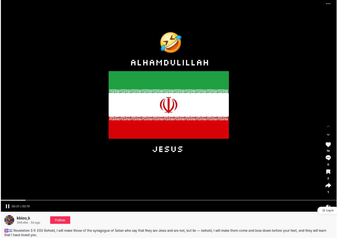 The video shows two slides. The first displays the flag of Iran’s Islamic regime alongside the words “Alhamdulillah” and “Jesus”, likely meant to glorify Iran’s attacks as divinely supported. The second slide presents a side-by-side comparison: a traditionally dressed Black man labeled as a “bloodline Judaen descendant,” next to an Ashkenazi Orthodox Jew labeled as an “Ashkenazi Khazarian converted in 7th century”. The terms “Jew” and “Jew-ish” are used to suggest that Ashkenazi Jews are frauds — a nod to the widely debunked and antisemitic Khazar theory, which falsely claims that European Jews have no real ancestral connection to ancient Israelites.