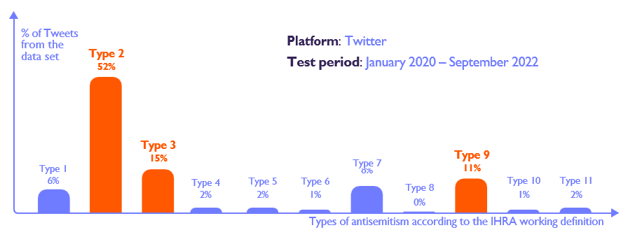 As of the writing of this report, since CyberWell began monitoring for online antisemitism in May 2022, there a total of 1,898 antisemitic Tweets that were collected, vetted and reported to Twitter. While this sample may be small, it is indicative of our capacity as a start-up non-profit supported by philanthropic donations – CyberWell’s technology and bundle of open-source intelligence tools, coupled with our IHRA specialized lexicon have the capacity to detect tens of thousands of pieces of antisemitic content. The full Twitter dataset from the relevant testing period is available here.