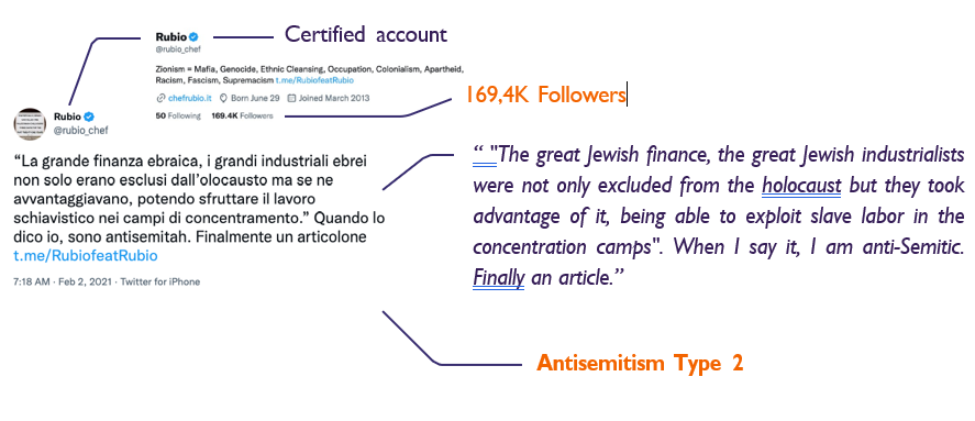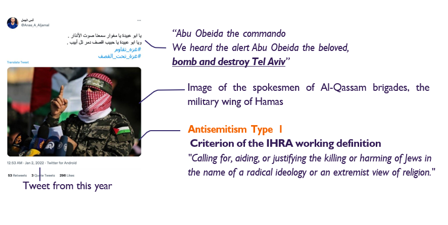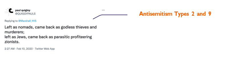 Criterion of the IHRA working definition: Type 3 “Accusing Jews as a people of being responsible for real or imagined wrongdoing committed by a single Jewish person or group, or even for acts committed by non-Jews.”