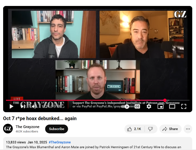 In this YouTube video below, titled: ”Oct 7 r*pe hoax debunked... again“, a known denier of October 7, Max Blumenthal, repeatedly denies the mass sexual assaults committed against Jews[17] on October 7. He refers to the “mass rape deception of October 7th” [00:15-00:16] and claims, ”there are zero complainants of alleged cases of rapes committed by Palestinians on October 7th, and no organized chains of evidence [...] Israel still can't find any October 7th rape victims, there's no testimony, no evidence [...]” [00:34-00:53]. The video promotes clear sexual violence denial, dismissing documented accounts from survivors and witnesses, and attempts to delegitimize evidence of these crimes.