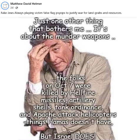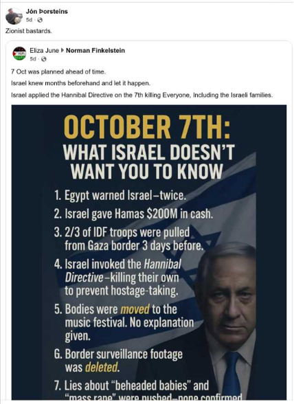 In the Facebook post below, the user advances antisemitic conspiracy theories and conspiratorial self-victimization rhetoric related to the October 7 attacks. The post invokes the antisemitic “fake Jews” theory, which falsely asserts that Jews are imposters, and further claims that Jews orchestrate false flag operations to manipulate global events. The attached meme reinforces these ideas, which suggests that Israeli forces, rather than Hamas, were responsible for the deaths of Jews on October 7. Together, the post and image promote demonstrably false narratives that deny Hamas’s role in the October 7 massacre and portray Jews and Israel as the aggressors, directly advancing antisemitic conspiracy theories.