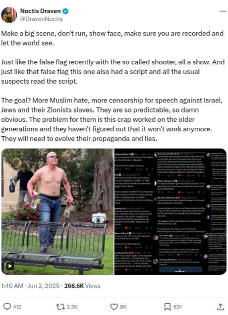 The tweet below illustrates this insight clearly, with the user alleging that Jews not only staged the Boulder Molotov Attack on June 1, 2025, but were also responsible for the D.C shooting that resulted in the murder of two Jews.