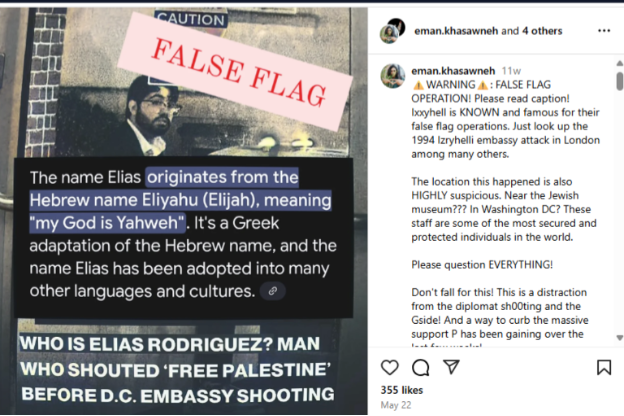In the Facebook post below, a user shared a video about the shooting of two Israeli Embassy staffers in Washington, D.C., with the caption “Thoughts???”. In the comments on her own post, she added: “Inside job?” and “We know how much they love killing their own”. By placing these antisemitic conspiratorial self-victimization remarks in the comment section rather than in the original caption, the user appears to attempt evasion of moderation while keeping the post publicly visible.