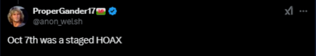 This category refers to narratives that blame Israelis for violent attacks committed against them. Rather than acknowledging Israelis as targets of antisemitic violence, CW4 posts allege that the attacks were staged, self-inflicted, or otherwise orchestrated by Israelis for political or strategic purposes. While less common than other categories, CW4 illustrates how denial and narrative inversion extend specifically to Israelis, portraying them as perpetrators rather than victims.