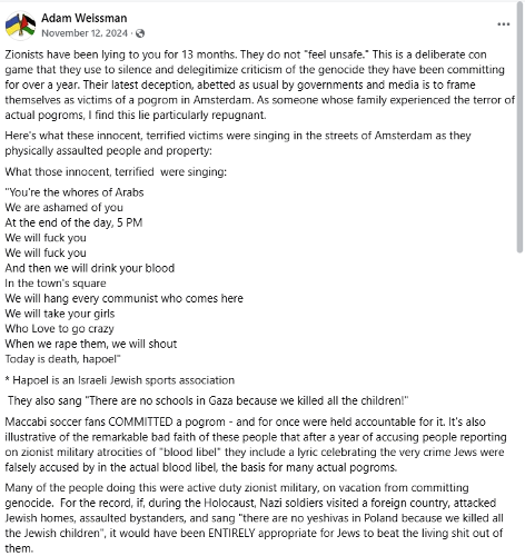 In this TikTok post, the speaker disputes the characterization of the November 7, 2024, antisemitic mob attack in Amsterdam as a pogrom. The speaker states: "[...] Only a couple days after the ADL said that I was antisemitic for not calling the football hooligan fight a, you know, a pogrom [...] Israeli mob violence in Amsterdam [...] false narrative insistently advanced by its own newspaper that the Israeli fans were victims of mob violence motivated by anti-Jewish hatred [...]" [00:15-02:43]. Alongside the video, the user adds the following description: “The so-called Amsterdam pogrom wasn’t actually a pogrom after all […]”.