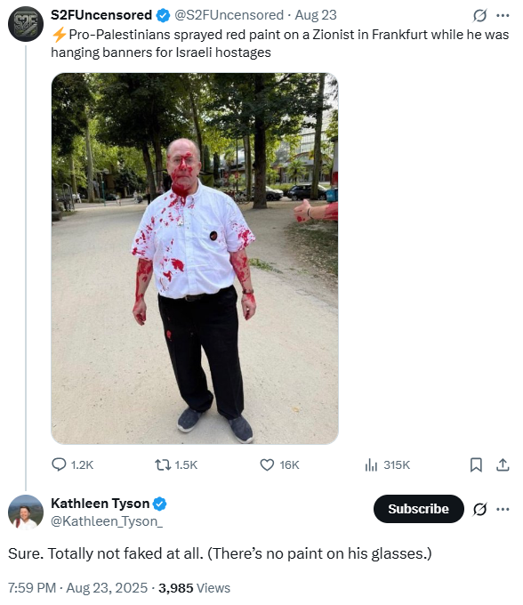 In response to a tweet about the Frankfurt red paint assault (August 23, 2025), the X user below dismissed the incident as fake, arguing that the photo could not be genuine because there was no paint visible on the victim’s glasses.