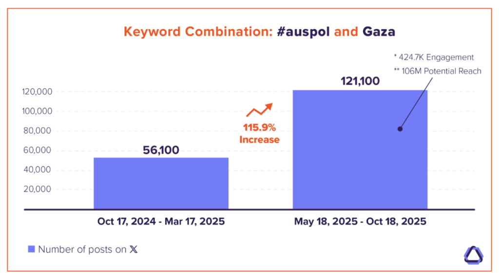 Keyword combinations #auspol and “Gaza” surged following political debates, media coverage, and mass rallies. Between May 18 and Oct 18, 2025, 121.1K posts on X used this combination, representing an engagement rate of 424.7K and a potential reach of 106 million, nearly four times Australia’s total population.