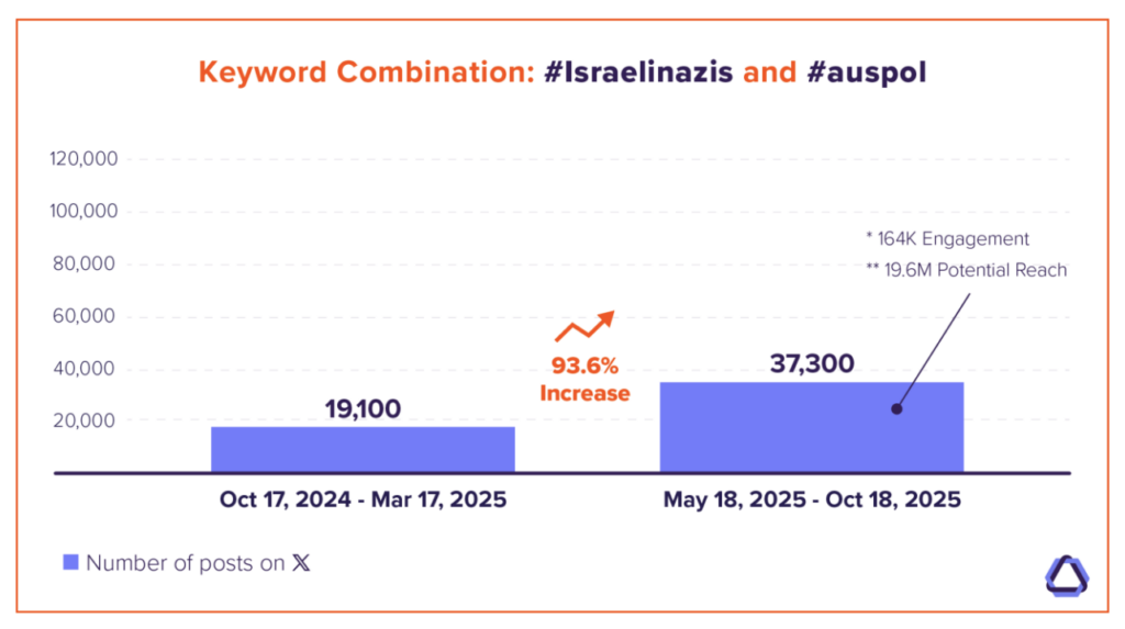 Between May 18 and Oct 18, 2025, the hashtag combination #Israelinazis and #auspol generated 37.3K posts, an engagement rate of 164K, and a potential reach of 19.6 million. By comparison, in the preceding five months (October 17, 2024- March 17, 2025), there were 19.1K posts – a 93.6% increase.