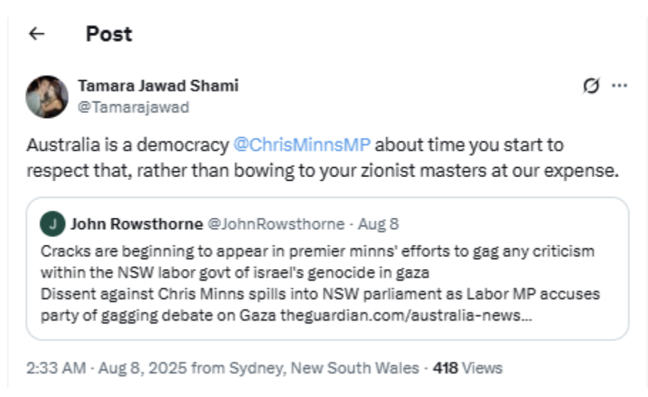 This rhetoric can be clearly seen in the following tweet, as the user references Jews as “Zionists”, and accuses the New South Wales Premier of “bowing to [his] Zionist masters”. Such language reinforces the antisemitic trope of Jewish control over political leaders and institutions, echoing patterns of classic antisemitic propaganda repurposed in a modern, digital context.