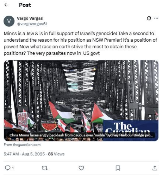 Finally, in another example, the user claims that Jews “strive to obtain positions of power” and are “parasites”. In this tweet, the user refers to New South Wales Premier Chris Minns (a devout Catholic) as Jewish. This deliberate misrepresentation serves a deeper antisemitic purpose: by labelling a non-Jewish political leader as Jewish, the user implies that “Jews” secretly control or manipulate political institutions. Under the International Holocaust Remembrance Alliance (IHRA) Working Definition of Antisemitism, targeting non-Jews who are perceived to be Jewish – or accused of serving “Jewish interests” – also constitutes antisemitism. This example therefore reflects not only hostility toward Jews, but also the broader conspiratorial worldview that underpins modern antisemitic rhetoric.