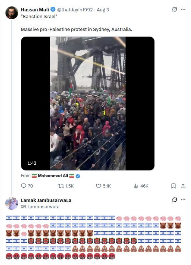 As noted, a growing concern emerging from the Australian online landscape is the increasing collapse of distinction between “Zionists”, “Israeli’s” and “Jews”. Across social media platforms, particularly in commentary surrounding the Gaza conflict and domestic protests, these terms are frequently used interchangeably. This conflation purposefully makes it nearly impossible to separate legitimate political criticism of Israel from prejudice directed toward Jewish individuals and communities.