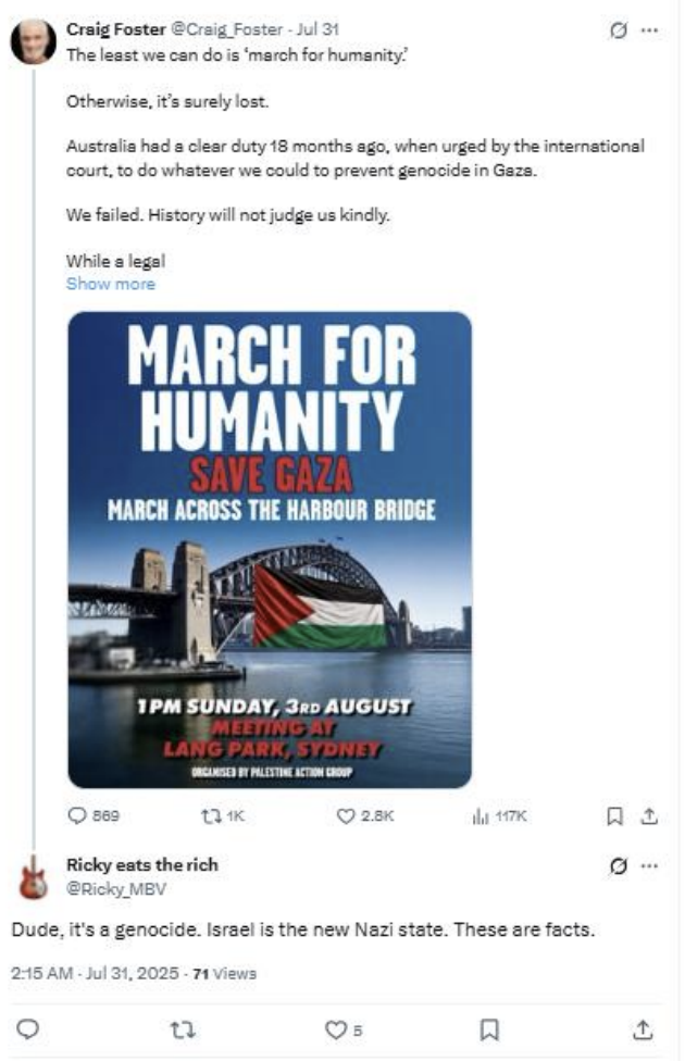 - August 3, during Australia’s largest “March for Humanity” pro-Palestinian protest.
