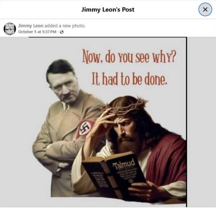 Finally, and most alarmingly, monitoring over the seven-month period surfaced content that veered into Holocaust justification. The Facebook post below features an image of Adolf Hitler beside a depiction of Jesus reading the Talmud – a central Jewish text that records rabbinic discussions on law, ethics and tradition, accompanied by the caption: “Now, do you see why? It had to be done”. This depiction implies that Hitler’s actions were warranted and openly portrays the Holocaust as justified. This fundamentally signifies a dangerous progression in online antisemitism, shifting from prejudice and conspiracy to the explicit justification and normalisation of systematic genocide.