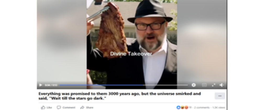Likewise, this example below found on Facebook, uses AI generated imagery to show Jewish men taking over strangers’ homes – and even picking a brisket up with tongs off one homeowner’s grill – claiming it was “promised to him 3,000 years ago.”