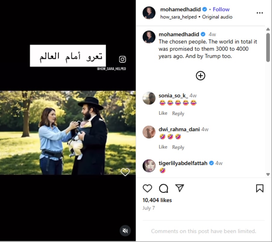 CyberWell has flagged over 100 examples of this trend to Meta, which have not been removed, including a video posted to Instagram by Mohamed Hadid to his 1.5 million followers (see the screenshot, below). As per the trend, the video depicts a series of AI-generated scenarios in which a series of visibly Jewish men claim items from other people under the guise that “it was promised to them 3,000 years ago.” These claims include personal items like a watch and get increasingly more ridiculous. Other items said to be “promised (to the Jews) 3,000 years ago” include a house, a shower, a soccer stadium – and even someone’s baby.