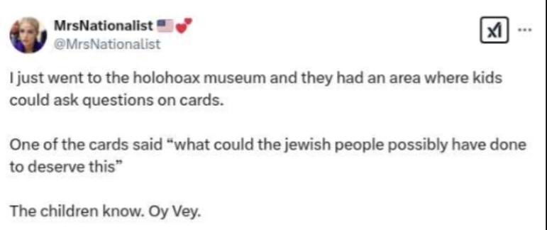 As such, the misuse of “Oy vey” reflects a broader trend of distorting Jewish cultural markers for the purpose of spreading hate or reinforcing antisemitic narratives online.
